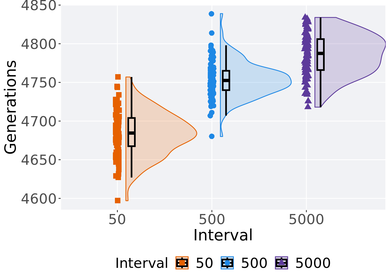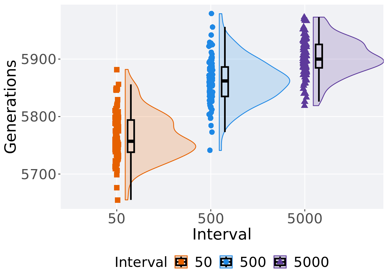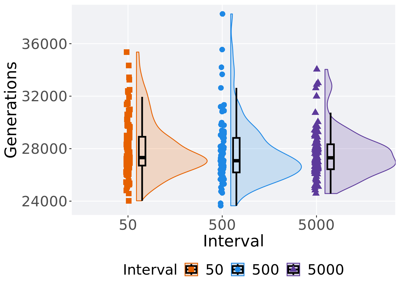 ggplot(., aes(x = Interval, y = Generations, color = Interval, fill = Interval, shape = Interval)) +