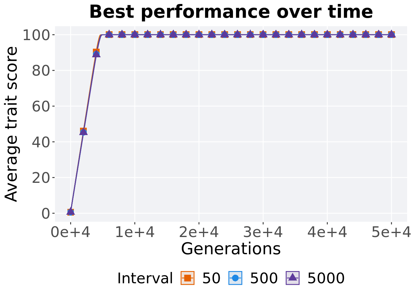 Here we present the results for best performances found by each selection scheme replicate on the exploitation rate diagnostic with our base configurations. For our base configuration, we assume 4 islands and a ring topology. When migrations occur, we swap two individuals (same position on each island) and guarantee that no solution can return to the same island. Best performance found refers to the largest average trait score found in a given population. Note that performance values fall between 0.0 and 100.0.