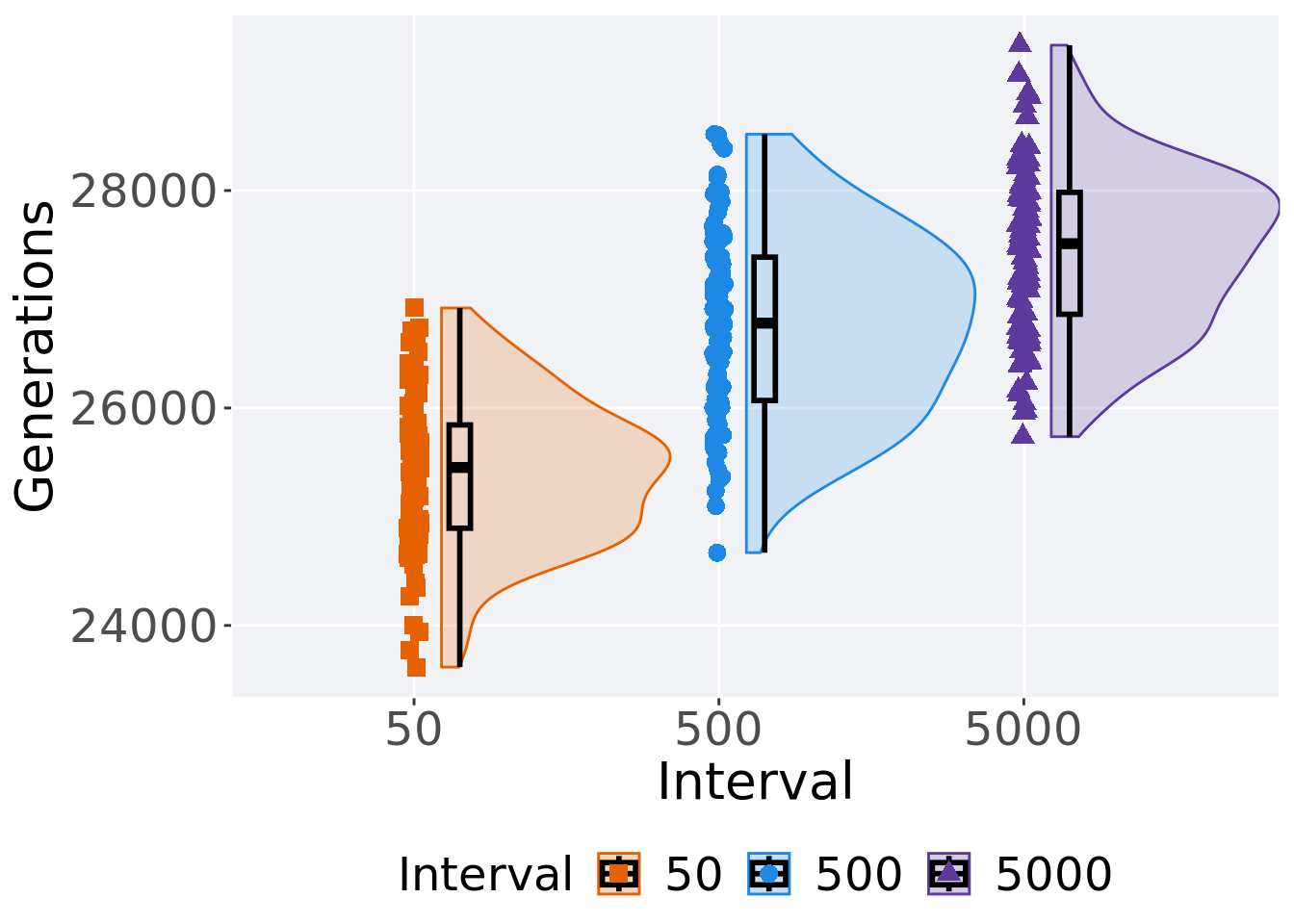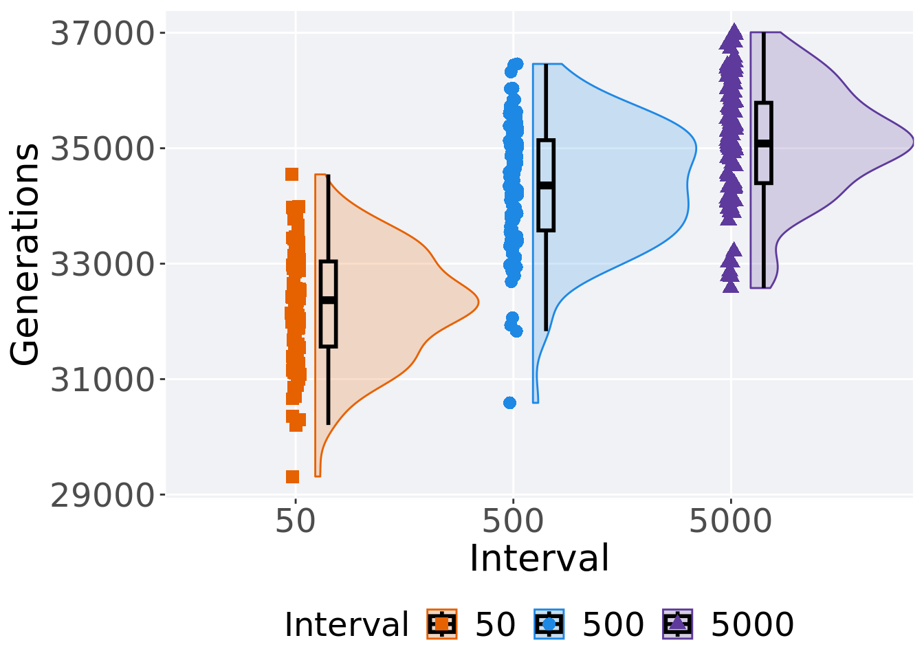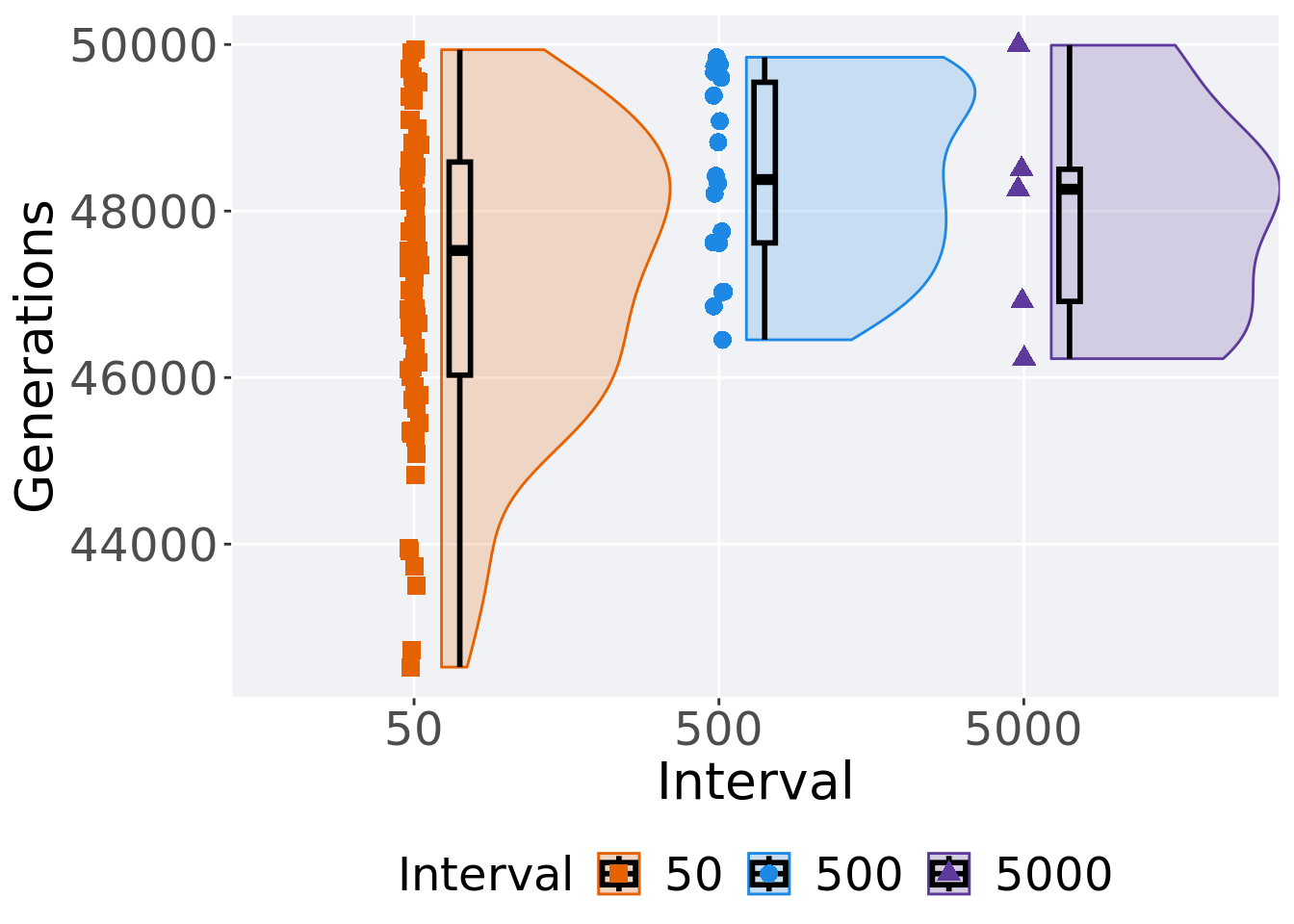 ggplot(., aes(x = Interval, y = Generations, color = Interval, fill = Interval, shape = Interval)) +