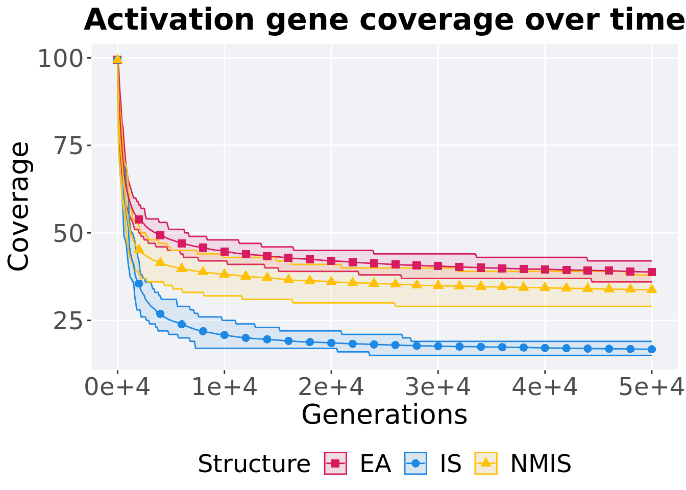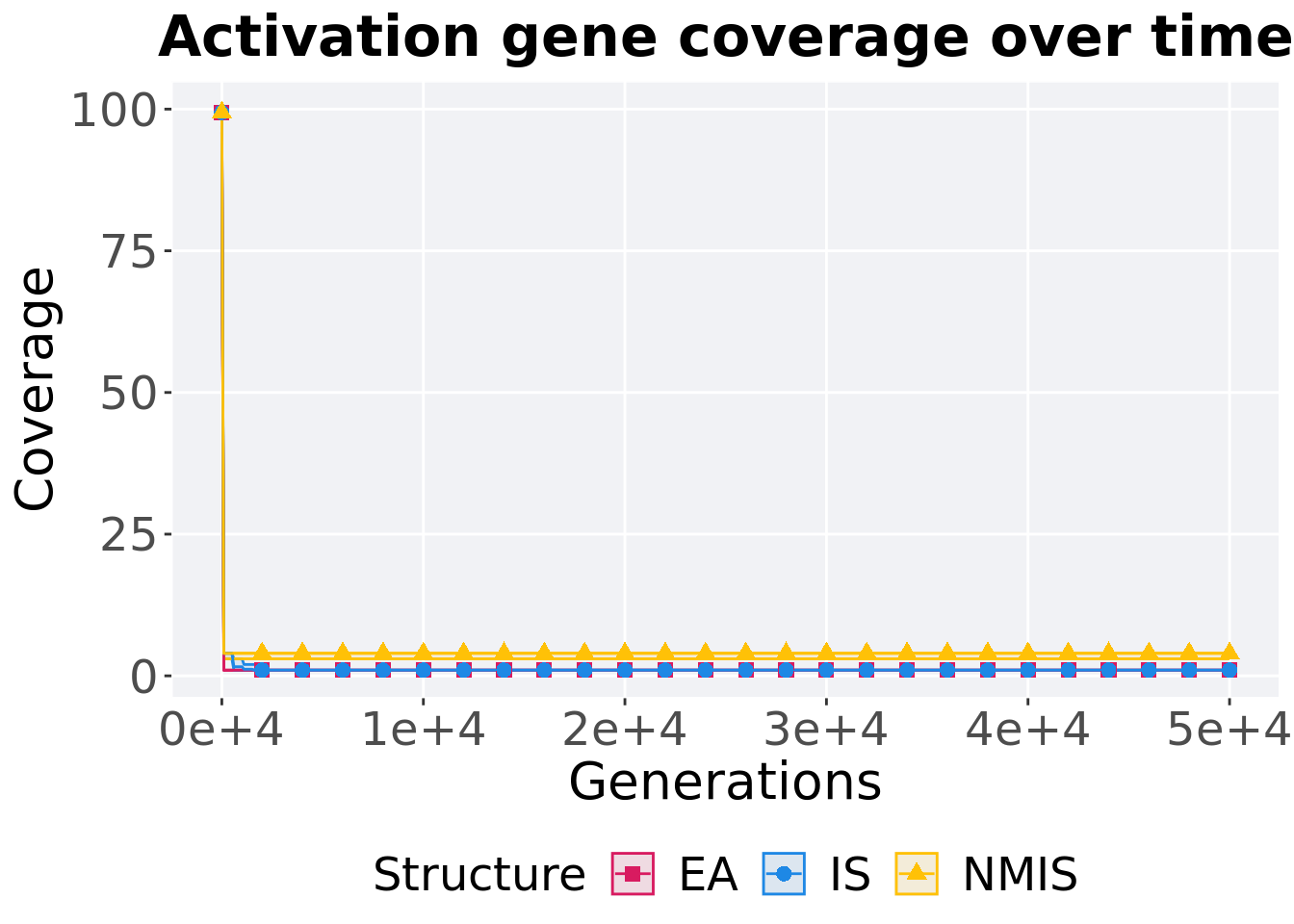 coverage = filter(base_over_time, Diagnostic == 'CONTRADICTORY_OBJECTIVES' & `Selection\nScheme` == 'TRUNCATION' & Generations == 50000)
