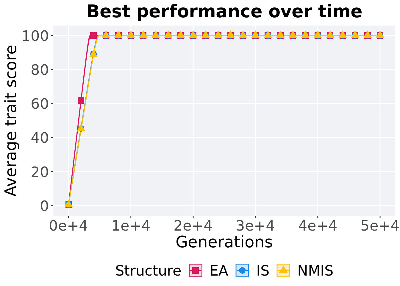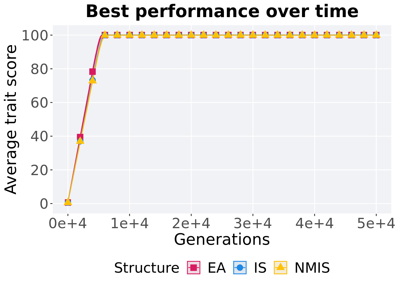 Here we present the results for best performances found by each selection scheme replicate on the exploitation rate diagnostic with our base configurations. For our base configuration, we assume that there are migrations every 500 generations, 4 islands, and a ring topology. When migrations occur, we swap two individuals (same position on each island) and guarantee that no solution can return to the same island. Best performance found refers to the largest average trait score found in a given population. Note that performance values fall between 0.0 and 100.0.