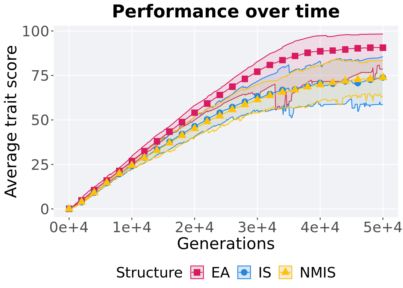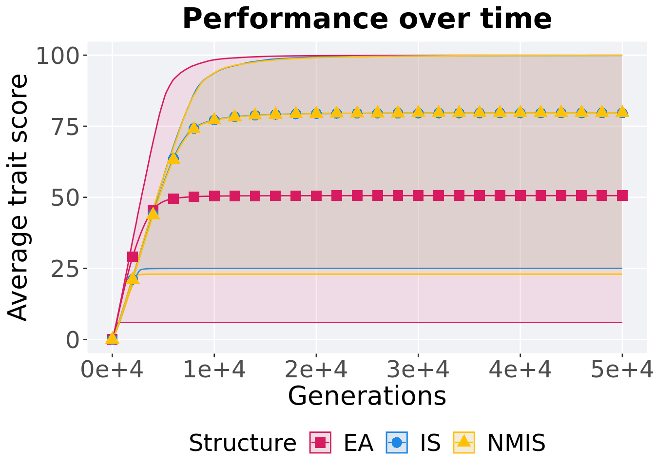 ggplot(lines, aes(x=Generations, y=mean, group = Structure, fill = Structure, color = Structure, shape = Structure)) +