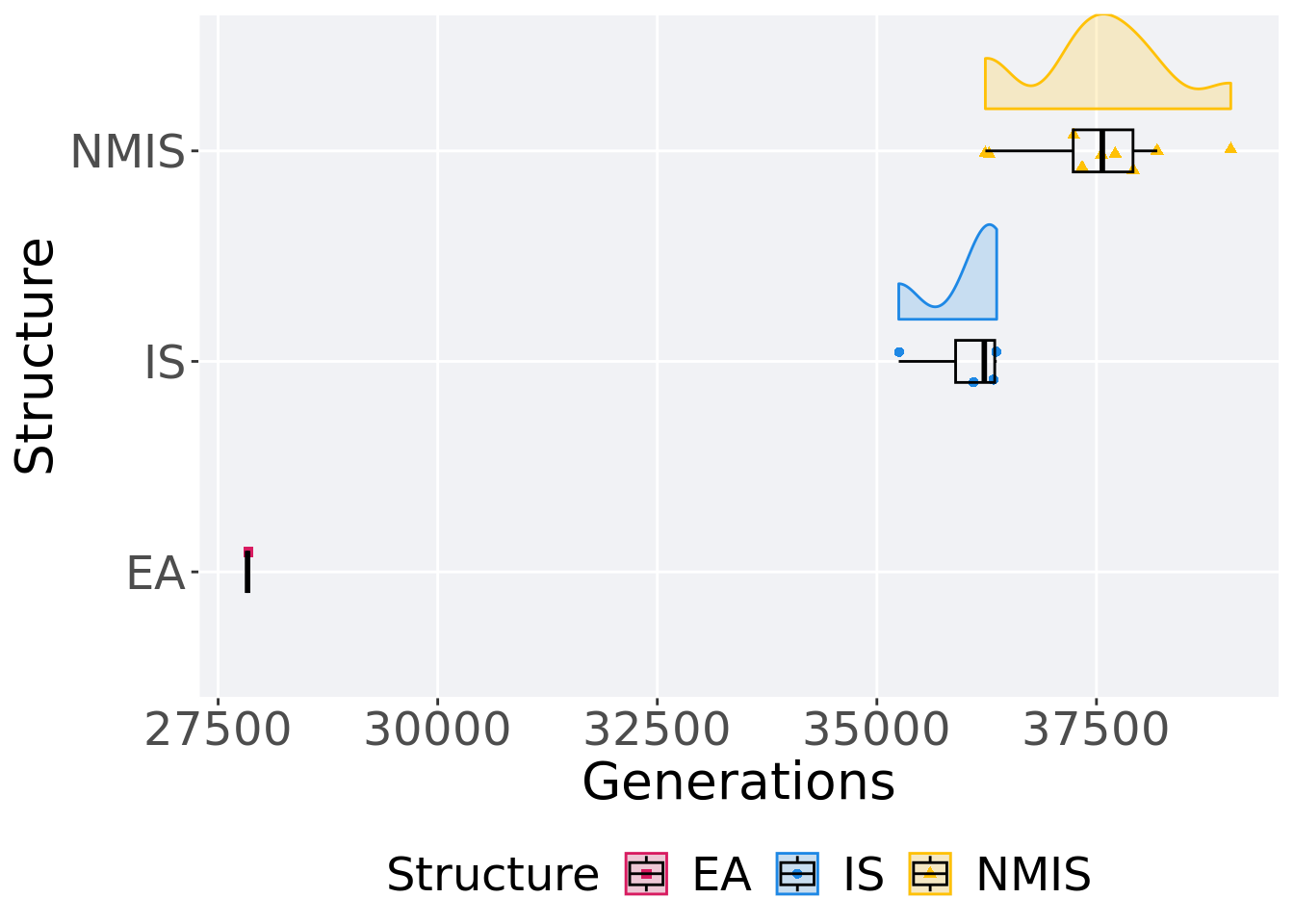 ggplot(., aes(x = Structure, y = Generations, color = Structure, fill = Structure, shape = Structure)) +