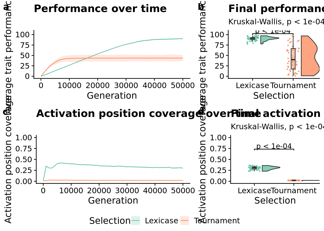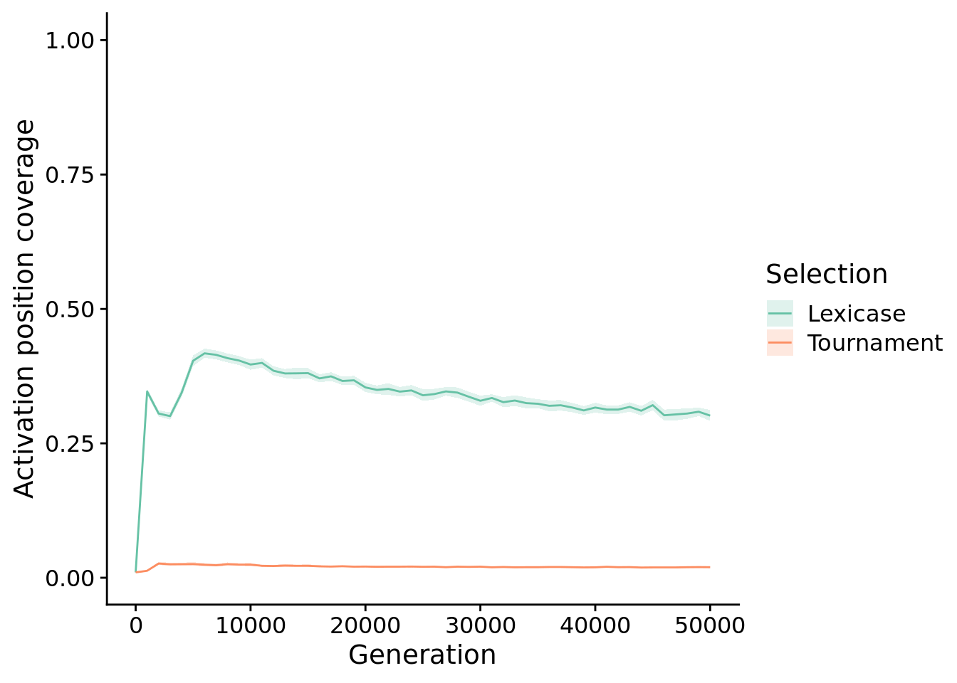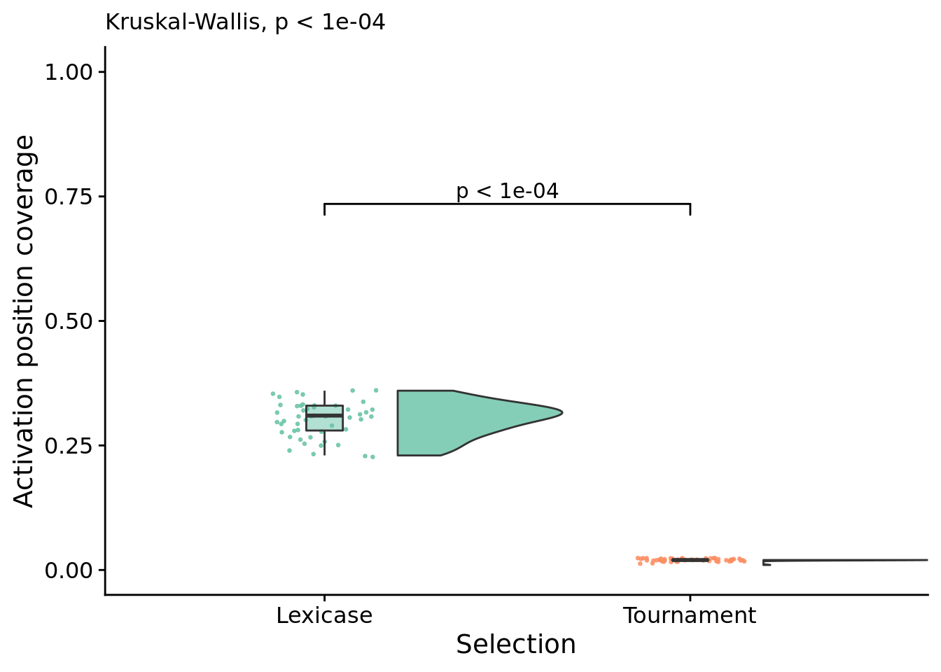 | unique_start_positions_coverage | Lexicase | Tournament | 50 | 50 | 2500 | 0 | 0 | **** | 0.7 | Lexicase , Tournament | 1 | 2 | 0.735 | p < 1e-04 |