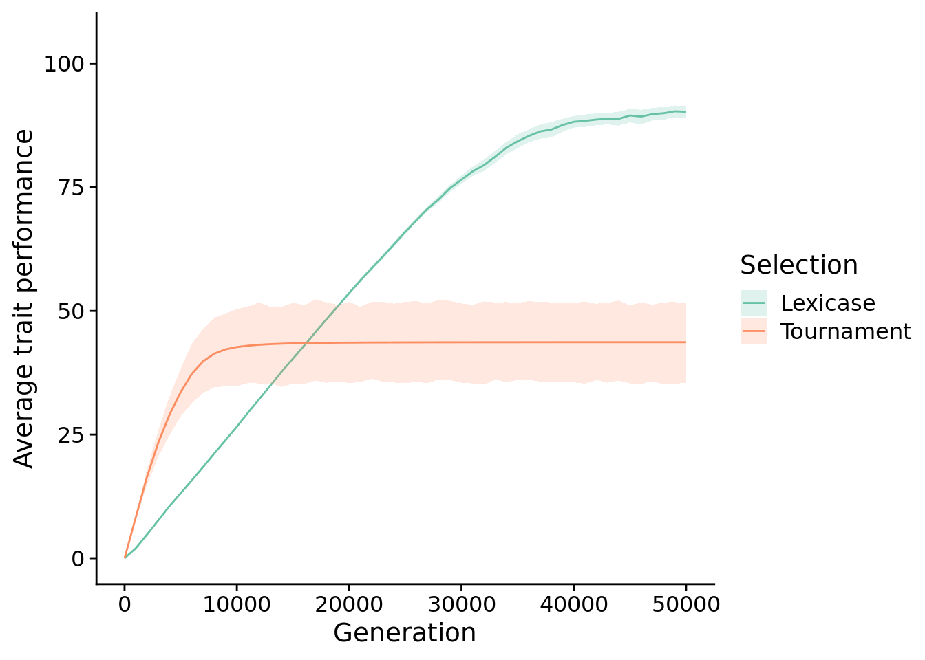 | elite_trait_avg | Lexicase | Tournament | 50 | 50 | 2357 | 0 | 0 | **** | 97.477 | Lexicase , Tournament | 1 | 2 | 102.3508 | p < 1e-04 |